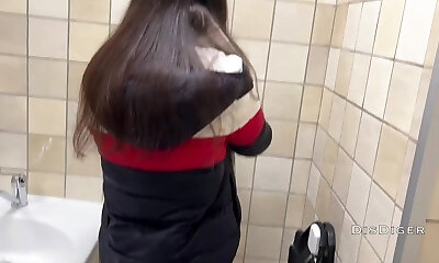 Big tits amateur steps into the toilet for a doggy style ravaging through a glory hole
