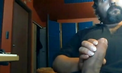 Huge hairy bear jerking a big cock in the converse