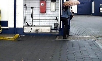 Chunky white stranger chick in denim skirt pisses in the rest room